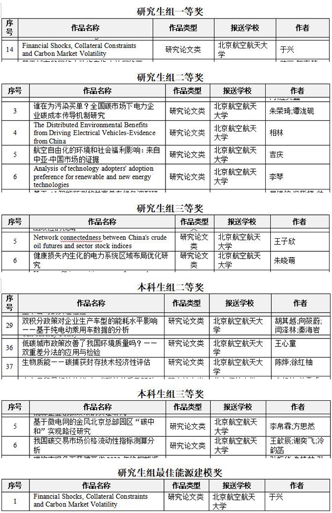 经过两天角逐,最终评选出5支本科生队伍和5支研究生队伍荣获特等奖,19支本科生队伍和19支研究生队伍荣获一等奖,其中4支本科生队伍和4支研究生队伍分别荣获最佳能源建模奖、最佳碳交易与碳市场研究奖、最佳泛能源大数据奖以及最佳调研报告奖等单项奖。同时,来自全国各地的63位教师荣获优秀指导教师奖,35家高校、研究院荣获优秀组织单位奖,44位教师荣获大赛组织贡献奖。