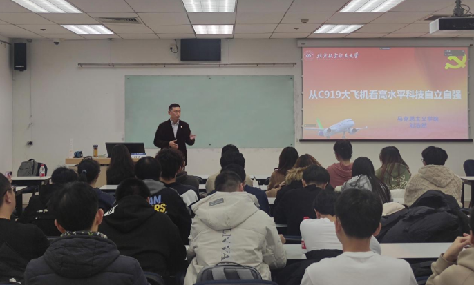 首先,由马克思主义学院刘浩然老师讲授题为《从C919大飞机看高水平科技自立自强》的专题课程。刘浩然老师从国产大飞机C919的故事谈起,结合党的二十大报告从如何理解、如何实现、大学生如何助力发展三个层面阐释了加快实现高水平科技自立自强的战略方针。深入了解唯有坚持党的全面领导,健全社会主义市场经济下新型举国体制,发展科研人才培养才能够实现高水平科技自立自强,从而进一步推进中国式现代化建设。