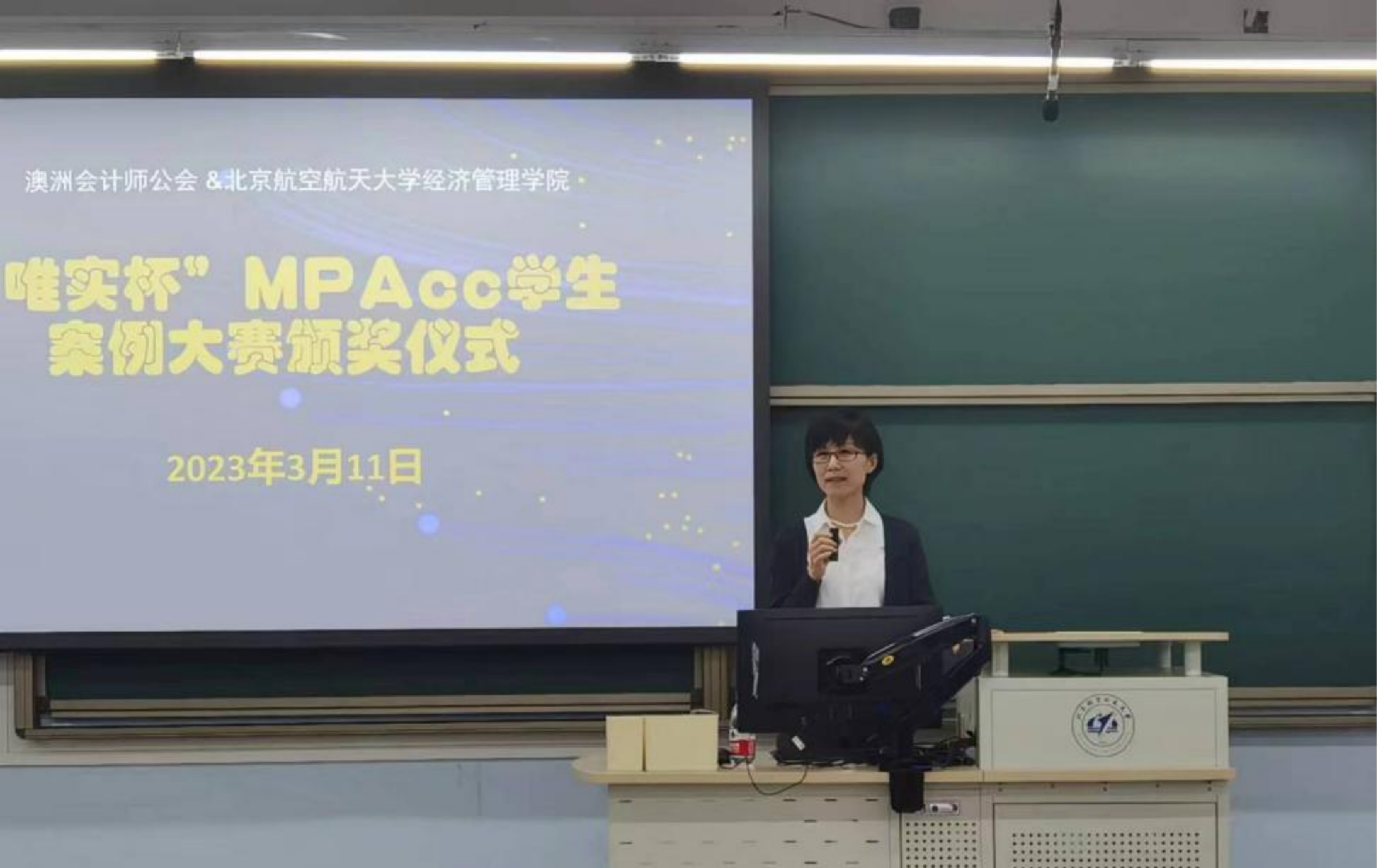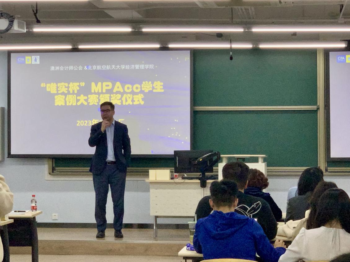 “向阳草木青,明媚春光暖,春天的美,俯拾皆是。”3月11日晚,北航经管学院“唯实杯”MPAcc学生案例大赛颁奖仪式在学院路教学区5号楼112教室隆重举行。2021级、2022级MPAcc研究生共百余人参加活动,澳洲会计师公会北京代表处首席代表孟文静女士、华北区委员会会长彭飞先生、财政部中国注册会计师协会国际及港澳台事务部主任宋祉健先生、中国铁建财务有限公司副总经理薛志辉先生、北京奔驰汽车有限公司战略与内部控制高级经理左晓帆女士、北航365上市公司官网副院长牟晖副教授、周宁教授、MPAcc教育中心副主任任晖老师出席颁奖仪式。仪式由365上市公司官网MPAcc教育中心主任白明副教授主持。