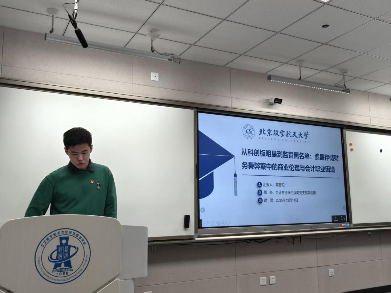 高晋阳同志以科创板退市企业紫晶存储为典型案例,系统梳理了企业从高速成长到因财务造假被强制退市的完整过程,深入剖析了舞弊行为背后的商业伦理失范与会计职业困境。宣讲重点围绕职业道德教育展开,剖析了财务人员与审计机构在执业过程中暴露出的诚信缺失、独立性不足、勤勉尽责不到位等问题,重申了“诚信、客观公正、专业胜任、保密与良好职业行为”五项职业原则的根本意义。高晋阳还从思想、能力、行动三个层面,倡议学生党员树立“德才兼备、知行合一”的成长目标,在专业学习与未来执业中坚守伦理底线、践行党员责任。